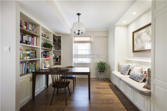 房間多處點綴綠植,清新自然,一整面墻的書柜輕松打造美式休閑風。慵懶愜意的下午,泡上一杯咖啡,讀一本自己喜歡的書,靜享這閑適、安逸的優雅時光。