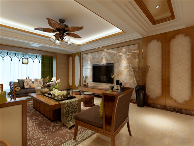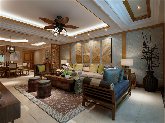 本案是充滿異域風情的東南亞風格裝修,用大膽的配色,濃厚的色彩,充滿自然氣息的家具、裝飾、線條打造富有熱烈、格調和美感的異域風情。其熱情、妖嬈、個性的美感,讓家呈現一種別具一格的家居特色。