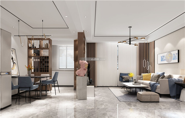 簡約雅逸的氣質,運用一些木質元素,讓家看起來更加溫馨和愜意。電視背景墻運用隔而不斷的屏風元素,實現中西文化的碰撞,讓層次更加豐富,空間也更通透。