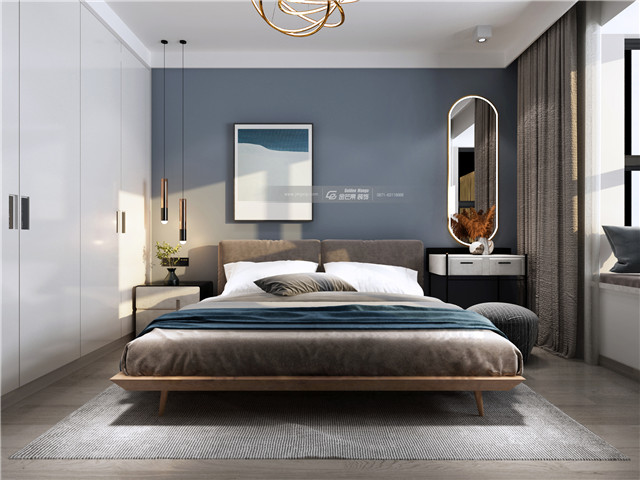 藍白色系,清新時尚的氣息充滿整個臥室。細膩溫柔的藍,定下沉靜的空間基調,讓臥室空間變得放松。精美的燈飾、裝飾,讓空間變得充滿時尚氣息。