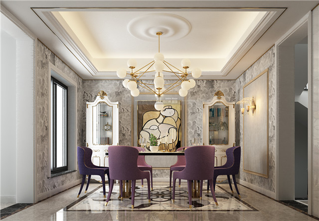 斜斜的吊頂摒棄常規,營造宮廷般的尊貴大氣感。神秘優雅的紫色始終貫穿全屋,貴氣拿捏得恰到好處,不失家的舒適,又彰顯靚麗與神秘優雅。彰顯貴氣的地毯,傳遞著空間主人對奢雅生活的態度,貴氣的金屬裝飾,在光影的光耀之家,讓家變得高級而尊貴典雅。