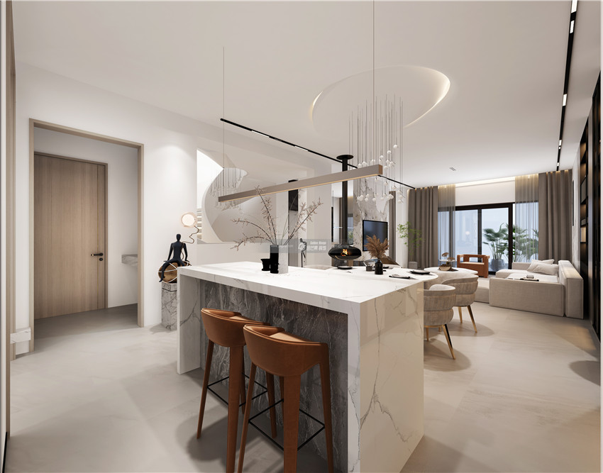 材料是現代的,形式是現代的,對功能布局的規劃與動線排布的思考也是現代的。光影材質和金屬線條讓時尚感蔓延,方正的白色沙發干凈利落讓空間更加簡潔。