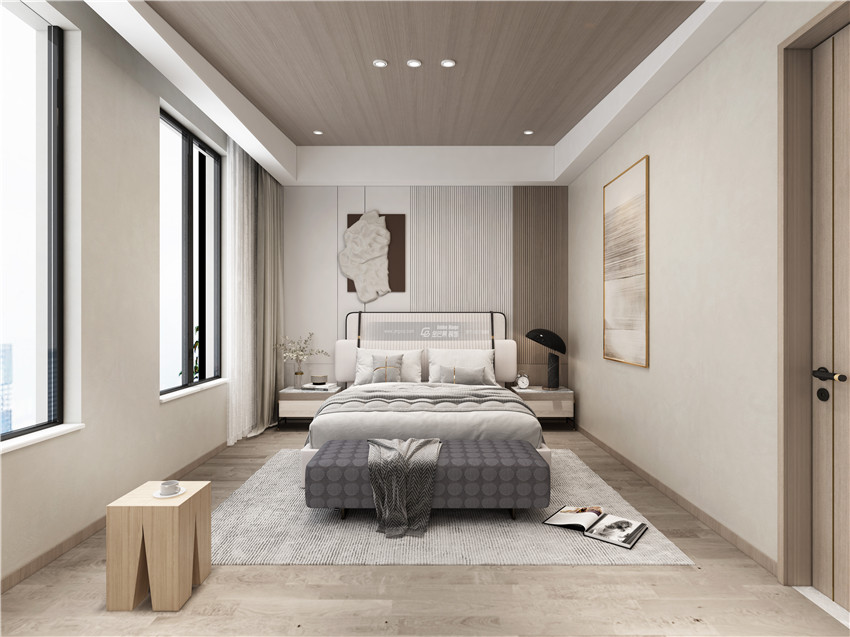 木材吊頂和朱紅色結合,帶來一絲復古韻味。床頭背景朱紅色裝飾畫渲染出的優雅氣息,讓家居格調變得韻味悠長。