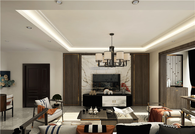 電視背景墻大理石上穿插中式圖案,現代與傳統文化的碰撞,魅力十足。同時兩邊的木飾面彰顯對稱之美。