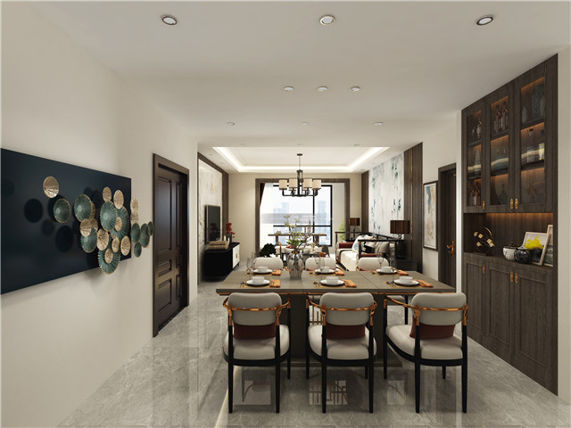 金屬的元素和典雅的木材結合起來,展現貴氣的中式風韻。餐邊柜更加彰顯中式的典雅之美。