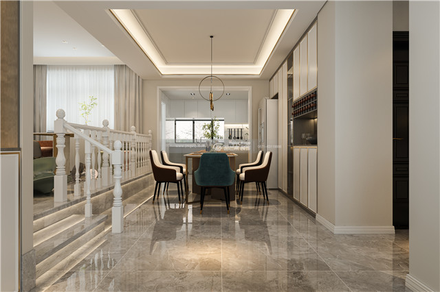 餐桌椅選擇簡約歐式的風格,增加奢華感,餐桌椅造型簡單卻格調滿滿,品質感自現。樓梯扶手形成一種隔而不斷的空間層次感,讓空間感更強。