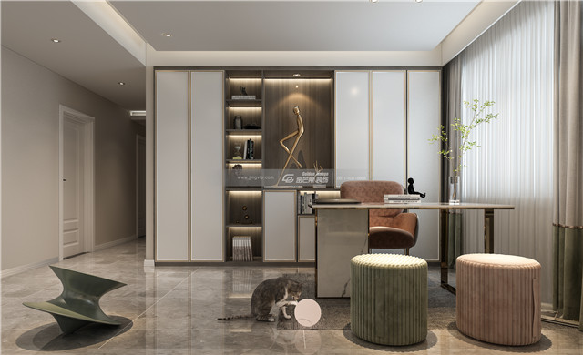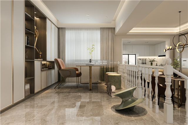延續整體空間溫柔細膩的感覺,優雅純凈的格調寧靜、優雅,賞一幅好景,閱一本好書,在安靜的空間里享受愜意生活。書柜木材與金屬線條的結合,沒有過多繁瑣的裝飾,確實簡約的高級。