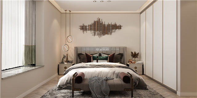奶油色系的臥室,加上了一些深色系的顏色,產生溫暖感,適合舒睡。溫厚的木地板加地毯舒適度滿滿。精致的燈飾,精致有格調。