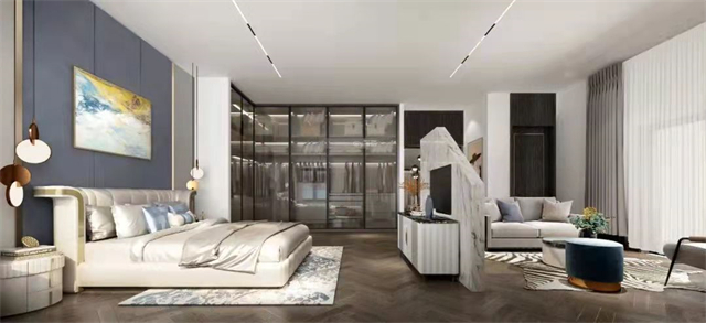 木地板通鋪,同個空間設計之下做了分隔,休息小談兩不誤,分隔處小嵌家電,再加之墻面茶波衣柜更顯品質。