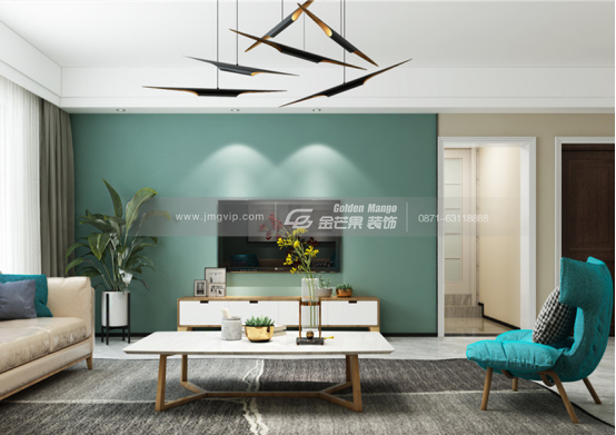 客廳整個(gè)空間主要以電視背景墻與沙發(fā)背景墻的顏色相呼應(yīng),獨(dú)特的吊燈設(shè)計(jì)有著很強(qiáng)空間穿透力,以及簡單的沙發(fā)和茶幾布置,再加上使用淺灰色的地磚,使得整個(gè)空間的色彩搭配達(dá)到極致,提升整個(gè)客廳空間的顏值。