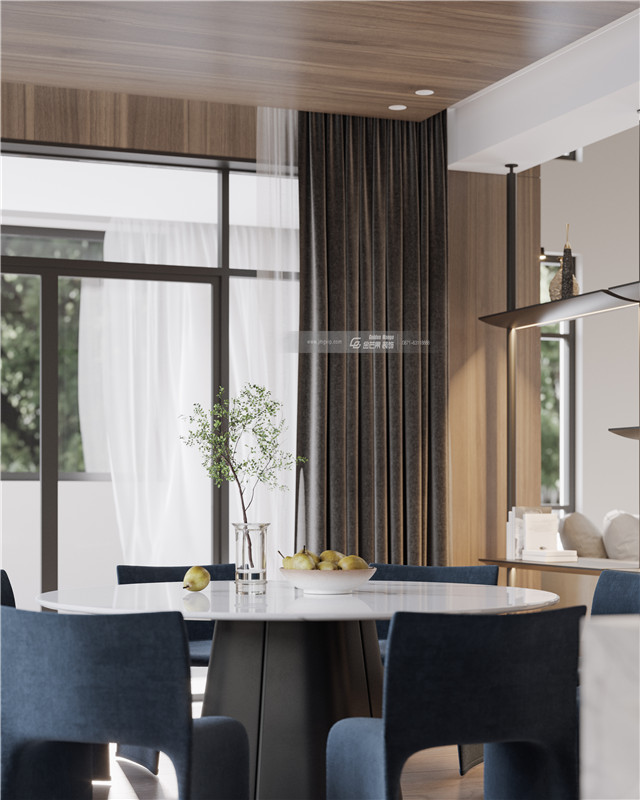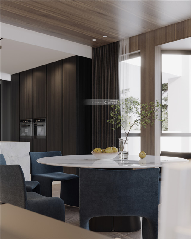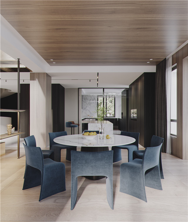 優雅的墨藍色、絲絨窗簾,簡約的大理石臺面,木飾面增加品質和溫度感,大理石臺面打造的是利落的高級感。簡約利落、誠摯靜美,打造高級感的高品質家居格調。