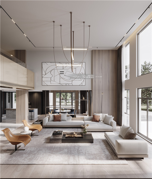 整體空間配色輕盈而不失溫馨,挑高的客廳設計讓空間展現獨屬大宅的非凡的氣度,加上配色和材質線條的加持,讓空間展現既大氣又不失細膩優雅的非凡格調氣質。