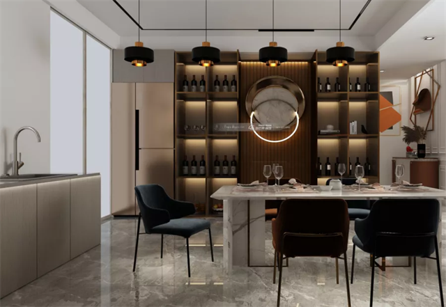 餐廳柜體多種材質(zhì)相互拼接,加之圓形飾品燈圍質(zhì)感驟然體現(xiàn),左側(cè)的亮面柜成了墻前的點睛之筆。