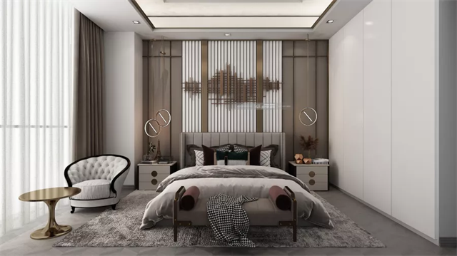 臥室突兀的墻柱,在床頭背景的豎條設(shè)計,飾品裝點,和搶眼的軟式家具布局下,和對稱的同色亮柜,所用材料用心有力。