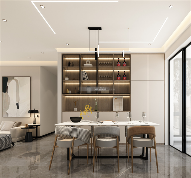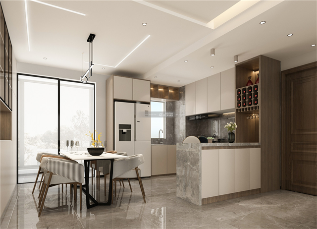 入戶進(jìn)來可以看到右手邊就是餐廳和廚房,開放式的設(shè)計(jì)使得整個(gè)餐廳的采光非常好,而且空間上比較寬敞和舒適。進(jìn)門右邊設(shè)計(jì)了酒柜,酒柜延伸出來是設(shè)計(jì)一個(gè)廚房島,這個(gè)廚房島的作用非常大,方便日常放菜和水果。