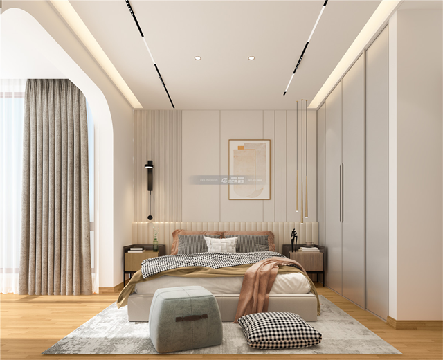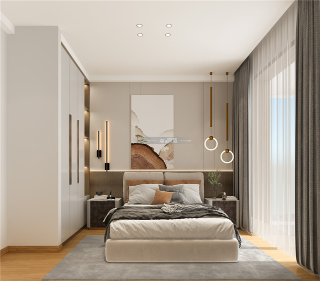 整體的顏色把臥室承托得溫馨而舒適,帶來很舒服的居住感受。溫馨的顏色里融入精致的小吊燈和裝飾畫,讓家居更加靈動(dòng)。柜體做到一門到頂,拉伸了整個(gè)空間。