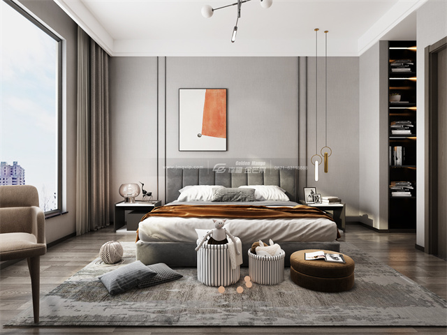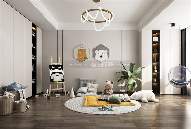 原本空曠的空間,在不同吊頂高度的區(qū)分下,區(qū)分了空間的實(shí)用性,加上利落的閉合式柜體設(shè)計(jì)和簡(jiǎn)約童真的小玩偶,地毯,畫架,掛畫,綠植,瞬間有了生起,還有旁邊的吊椅,實(shí)用舒適還陪伴了孩子,暖心而快樂(lè)。