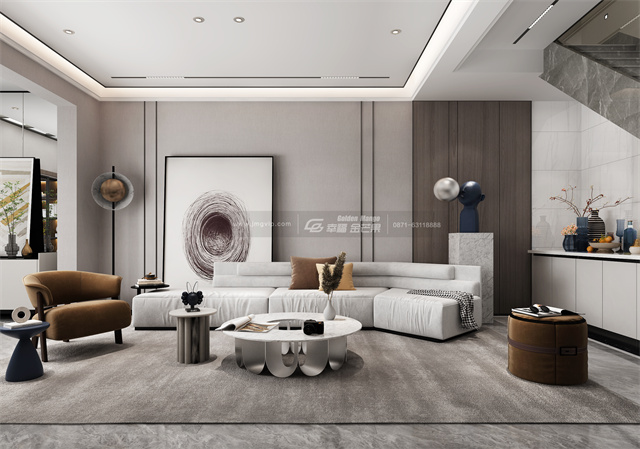 簡(jiǎn)潔的方型吊頂,加上圓筒、直線射燈和燈帶營(yíng)造的氛圍,加之不同顏色的材質(zhì),形狀,經(jīng)典配飾,耐人尋味,主人在這樣的空間里享受著寬敞和舒適。