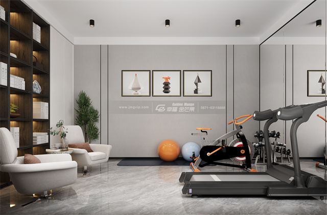 簡(jiǎn)單實(shí)用的配置,有鏡面,有健身器械,有格調(diào)的軟式桌椅,還有定制的柜子,和細(xì)細(xì)的線條點(diǎn)綴墻面,空間剛剛好。