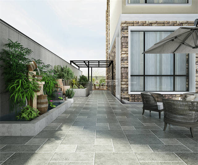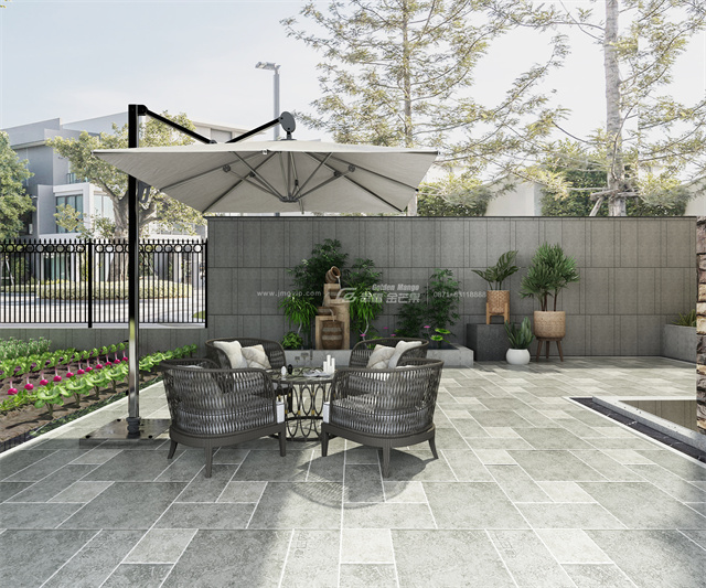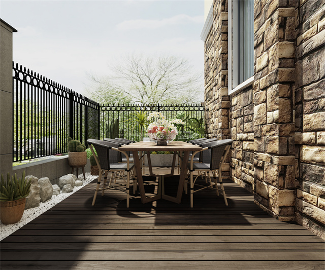 原外墻石材裝飾和軟裝家具的常規(guī)配置下,圍欄石材與鐵格柵的呼應(yīng)下,綠植和小碎石的加入,大大的光線,溫暖而舒適。