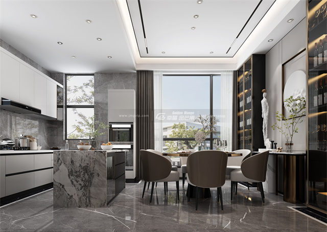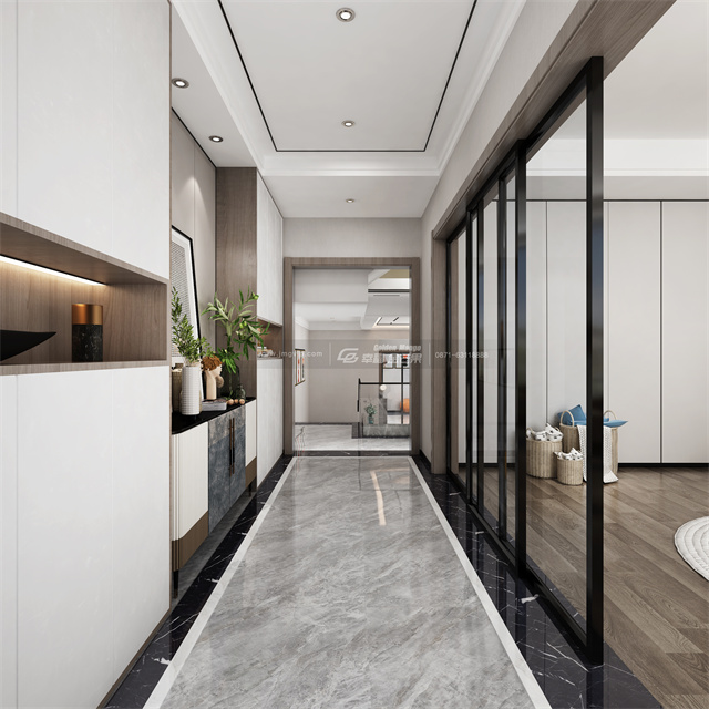 地面瓷磚的拼貼勾勒,加上原本寬大空間的柜體對(duì)稱設(shè)計(jì),以及不同層高的吊頂,過(guò)道的走動(dòng),空間的感覺(jué)瞬間有了區(qū)分。