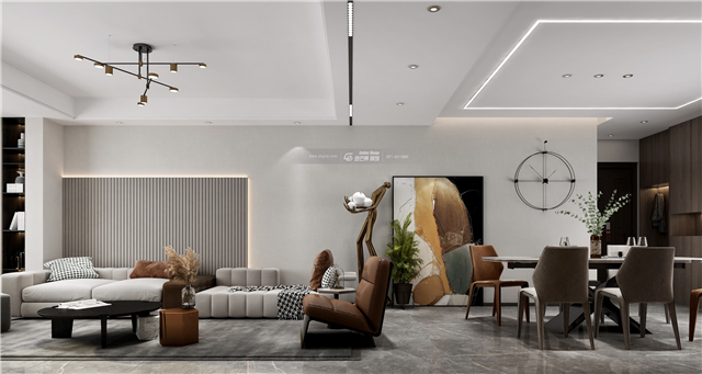 開(kāi)放式客餐廳帶來(lái)良好的氛圍感,讓空間互動(dòng)性更強(qiáng)。經(jīng)典的顏色玩轉(zhuǎn)高級(jí)黑白灰,融入金屬元素和有質(zhì)感、有儀式感的家具增加空間輕奢感。亮色的裝飾畫(huà)讓空間變得活潑起來(lái)。