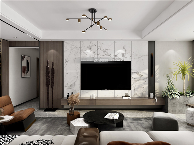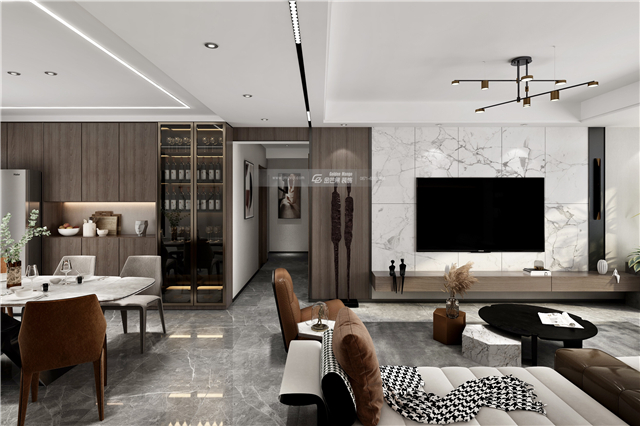 電視背景墻用大理石材增加空間高級(jí)感,石材花紋讓空間變得更加有意境和優(yōu)雅。大量的木材的運(yùn)用增加溫暖感,搭配金屬玻璃的酒柜,時(shí)尚感滿滿的同時(shí),家的舒適度也彰然顯現(xiàn)。