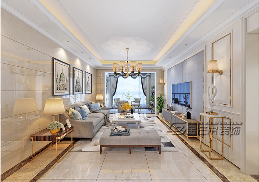 電視背景墻以淺紫色做搭配,金色鑲邊的電視柜透露著巴諾克風格的元素高貴奢華。