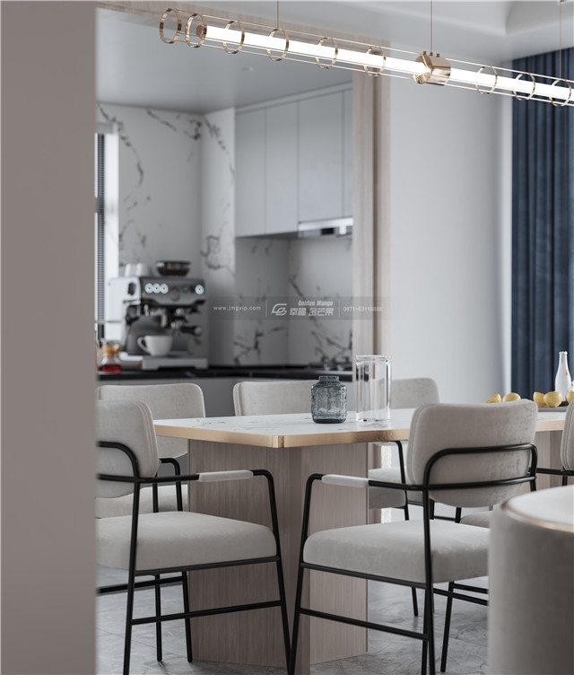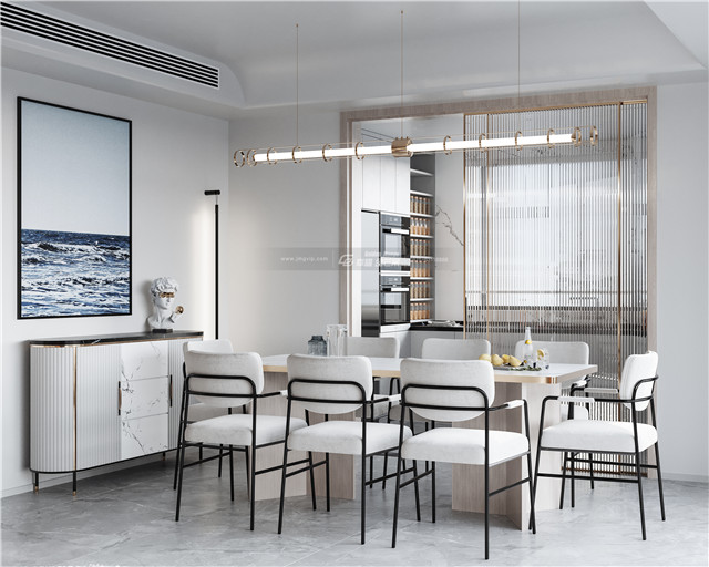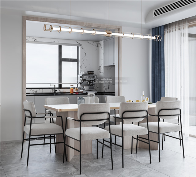 經典的黑白搭配,既展現高級的格調,又不失清新之感。采用細線條餐椅,展現精致感的同時,醞釀細膩溫柔的家居體驗。