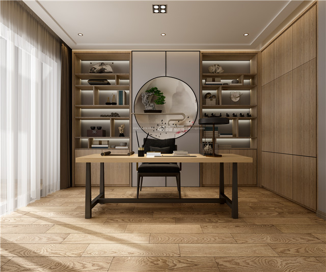 從現(xiàn)代的元素里面尋覓了顏色、材質(zhì),通過(guò)東方禪意美學(xué)的組合,將喧囂張揚(yáng)的明黃原木與水墨重組,為書(shū)房的沉靜空間提了亮。