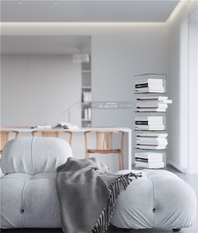 沒有過多線條的裝飾,簡單自由,大面積的白,純凈而安靜,心也變得清靜無比,真誠而一層不染。透明的書架是整個空間的亮點,點亮空間而個性十足。一個透字貫穿全屋。