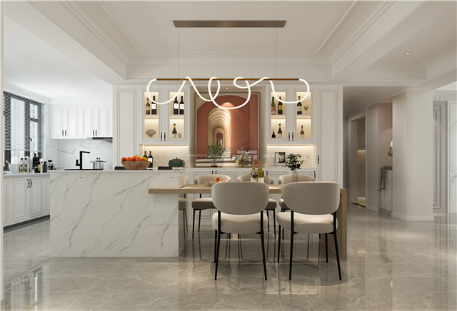 以象牙白為基調,整體奢華而充滿儀式感,營造儀式感滿滿的用餐空間。奢華的造型,精致的餐具,中西廚結合的餐廚空間,盡情展現大宅氣度,彰顯貴族般的質感生活。