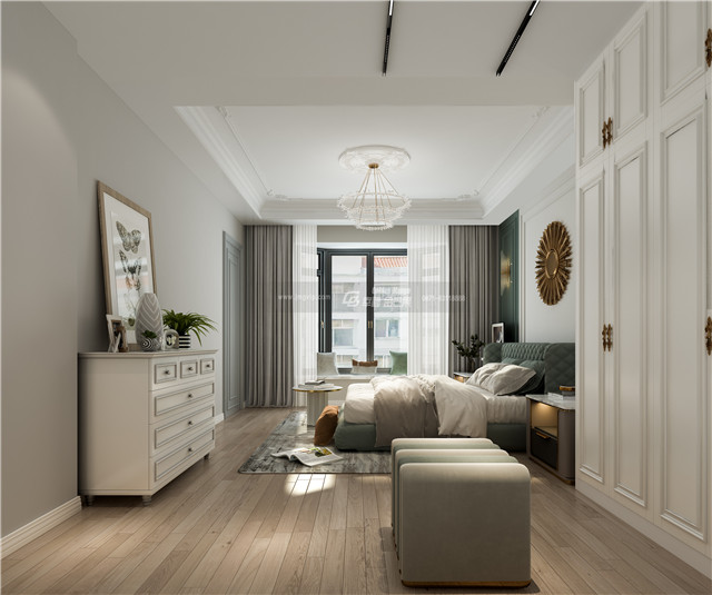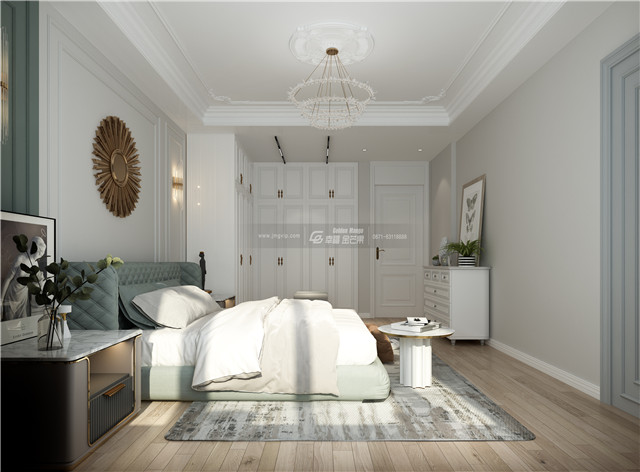擁有貴族般的至高待遇,舉手投足都變得優雅起來。吊頂上的雕花設計,優雅而不失高貴的墨綠色搭配,華麗的斗柜,品質感滿溢的木地板,處處可見用心,華貴的氣質下,藏不住的格調生活,蔓延全屋的歐式浪漫情調。