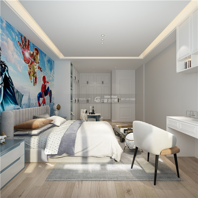 床頭背景墻是一整面的動漫人物,充滿無限的想象力和創造力,不斷突破桎梏,孩子的未來擁有著無限的可能。
