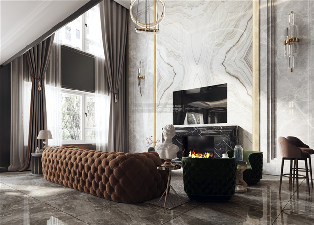 挑高的電視背景墻用大理石做背景,簡約時尚,氣度非凡。一盞華麗的燈飾更將空間的氣度拉升。電子壁爐升起溫暖的火焰,橘色沙發、綠色單椅將空間溫暖的氛圍承托得恰到好處。