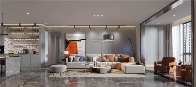 開放式廚房時(shí)尚之余,用花紋營(yíng)造屬于家的溫暖和可愛的感覺。用橘色點(diǎn)綴打破灰色帶來(lái)的冷峻感。一盞時(shí)尚感滿滿的落地?zé)麸棧錆M精致感和空間個(gè)性。