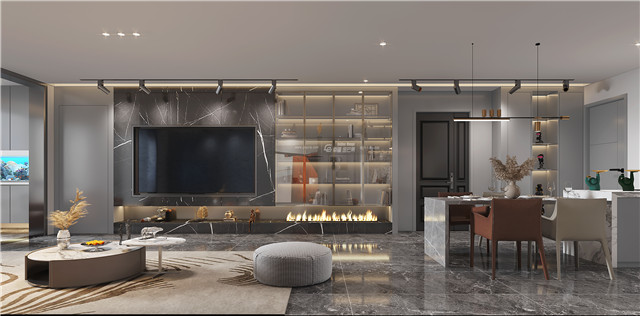 整體是非常個(gè)性時(shí)尚的裝修格調(diào),一入戶就能感受到屋主與眾不同的個(gè)性主張。灰色地板磚和灰色大理石電視背景墻,電視柜等,奠定優(yōu)雅的格調(diào)。電視背景墻搭配玻璃的收納柜,若隱若現(xiàn)營(yíng)造朦朧的時(shí)尚感。用燈帶和軌道燈在背景上投下光影效果,氛圍感更佳。