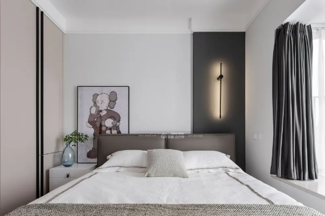 床頭背景墻使用木紋拼貼鑲嵌金屬條用以分割,提取自然及生活中的美學(xué)元素,構(gòu)筑出藝術(shù)氤氳的舒適空間,