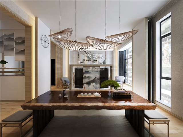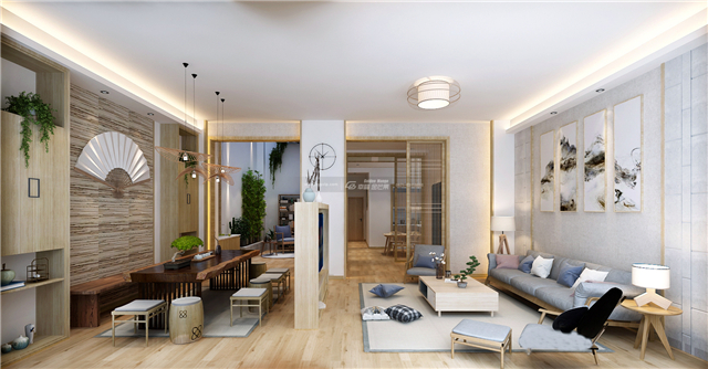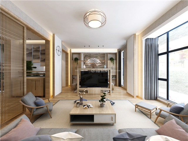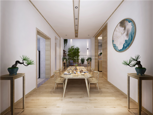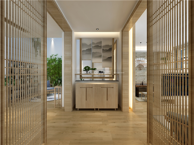 氣淑風和,如沐和風。入戶的格柵門和滿目的原木,樸實而又干凈素雅,水墨畫裝飾,頗為家居增添幾分禪意,韻味更加濃厚。
