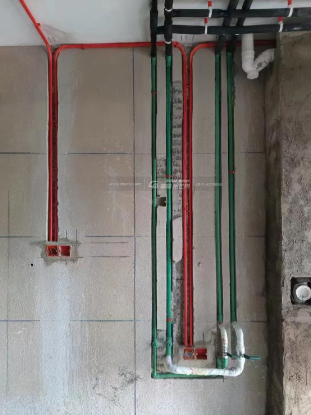出水口間距150mm,相鄰冷熱出水口高度一致。頂面管線宜分層布置:從上到下分別為電路、熱水管、冷水管、下水管,相鄰管線間距≤50mm,不得接觸,不宜使用過橋彎。走頂水管需用海綿管包管,再用線卡固定。