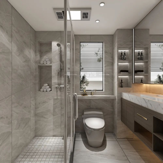 衛(wèi)生間運用了深灰、淺灰和白色瓷磚的混搭,同時設(shè)計了長鏡柜配合燈帶,整個空間層次豐富又顯得十分明凈爽潔。一家三口一天的好心情,皆從晨漱開始。