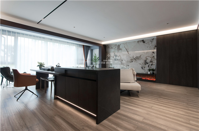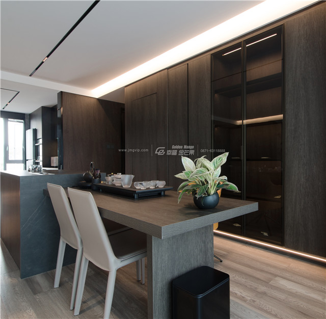 門、矮柜、門套選用高級整木定制,大面積定制柜體和墻板,便有了呈現出來的顏色和諧統(tǒng)一的效果,空間感更佳。