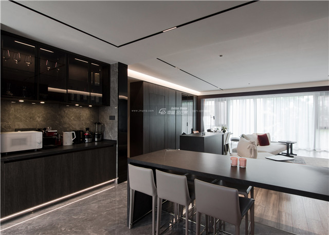 一個人獨處的空間,設計規(guī)劃也可以任性一些。吧臺和定制酒柜,正好呼應客廳交友聚會的需求。