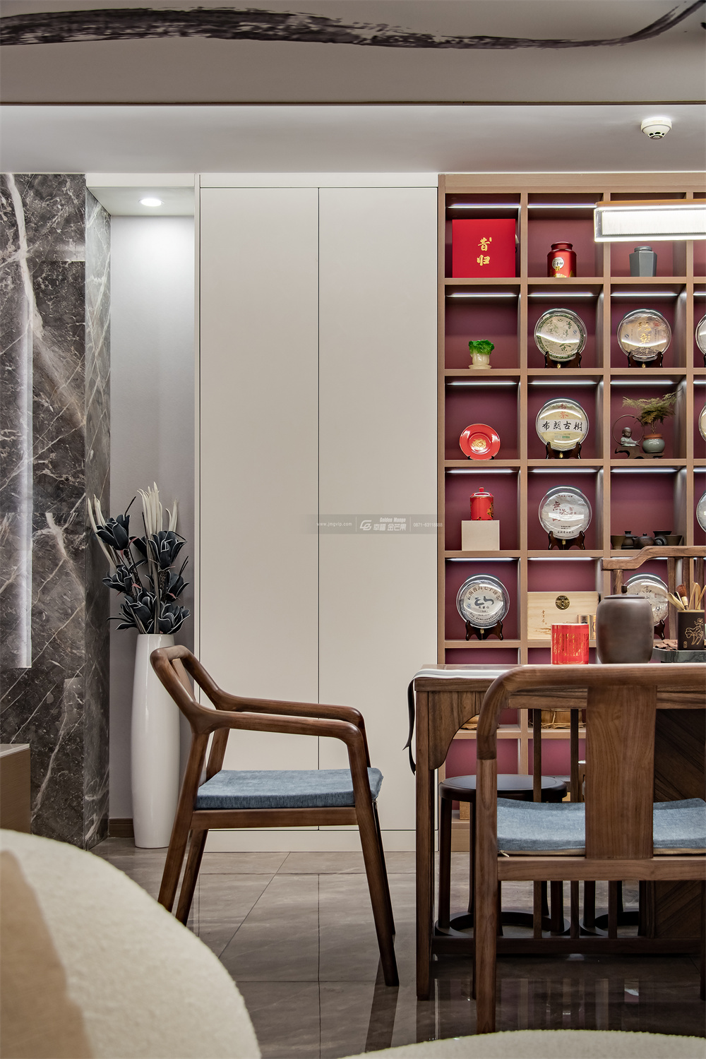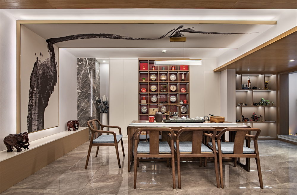 人生一愿,有間茶室,安頓身心,撫慰余生。古樸的茶桌椅、博古架,串聯起貫通古今的時代的印記。一幅山水畫,寄托屋主瀟灑逸然的閑思。偶寄閑情,暫忘喧囂,邀二三知交,煮茶、解語。