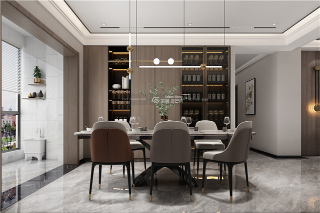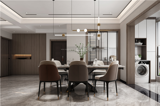 木質的餐邊柜,溫厚而有質感,增加空間的溫暖感,整體色調和諧統一,空間井然有序的簡潔更顯高級。