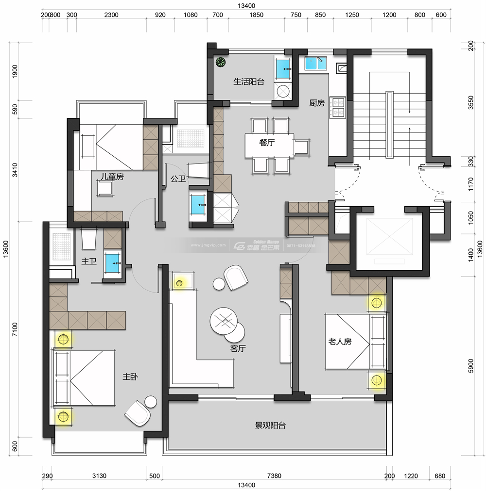 沒有強沖擊力的色彩,而是以大地色作為主色調(diào),很符合老年人沉穩(wěn)低調(diào)的氣質(zhì)。金屬吊燈與射燈的結合,令空間充滿設計感。迎著朝霞、伴著微風,還可以賞著美景,在這樣舒適的休憩空間里,老人一定是心滿意足的。