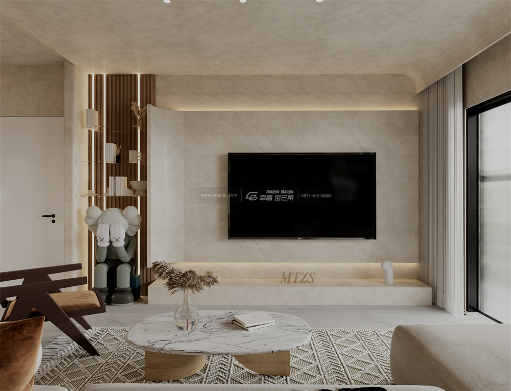 天花頂面、電視背景墻均使用微水泥一體打造,營造出文藝質(zhì)樸的侘寂基調(diào),生活不用那么擁擠復雜,適當?shù)牧舭滓彩且环N智慧!