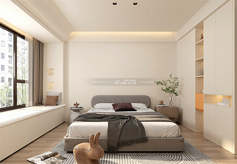 主臥空間利用奶油白作為基礎繪色,造型簡單又不失精致,溫柔治愈又高級,一眼望去就令人舒服自在,感覺空間每一處都剛剛好!
