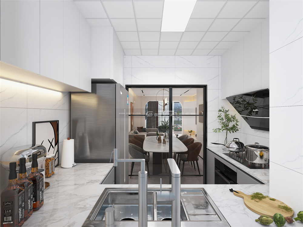 為了讓廚房清清爽爽,整個廚房空間選用了清新自然的白色與灰色,外觀簡潔不占空間,整體高級又簡約便利。還定制了透明推拉門,再也不用擔心油煙亂跑啦!