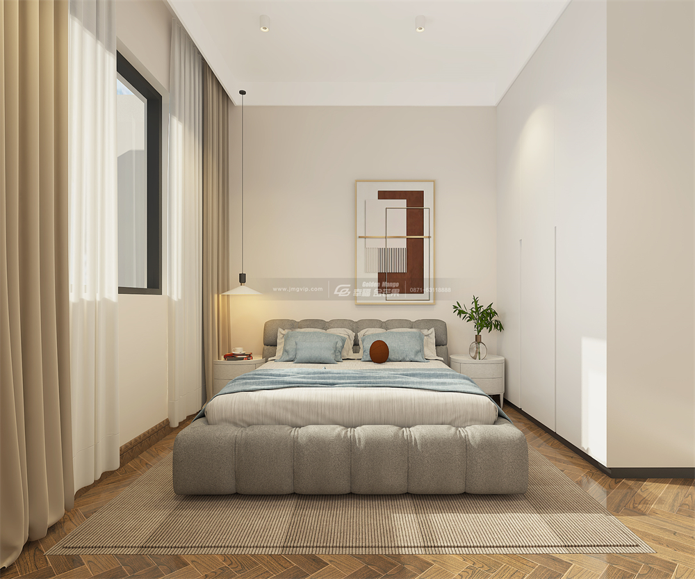 次臥在軟裝色彩上選擇了淺灰色、藍色,空間在沉穩中又多了一絲靜謐,望一眼便心生無限的寧靜悠遠。